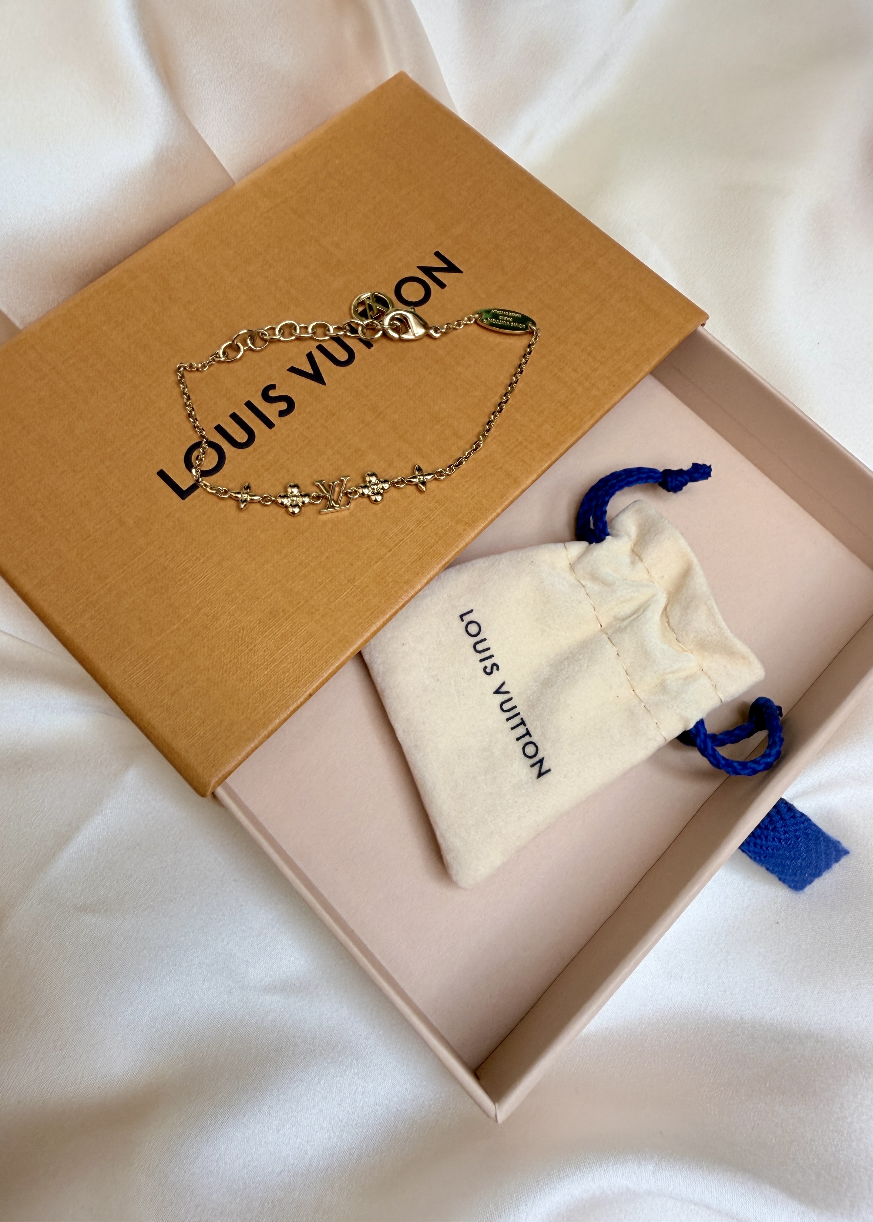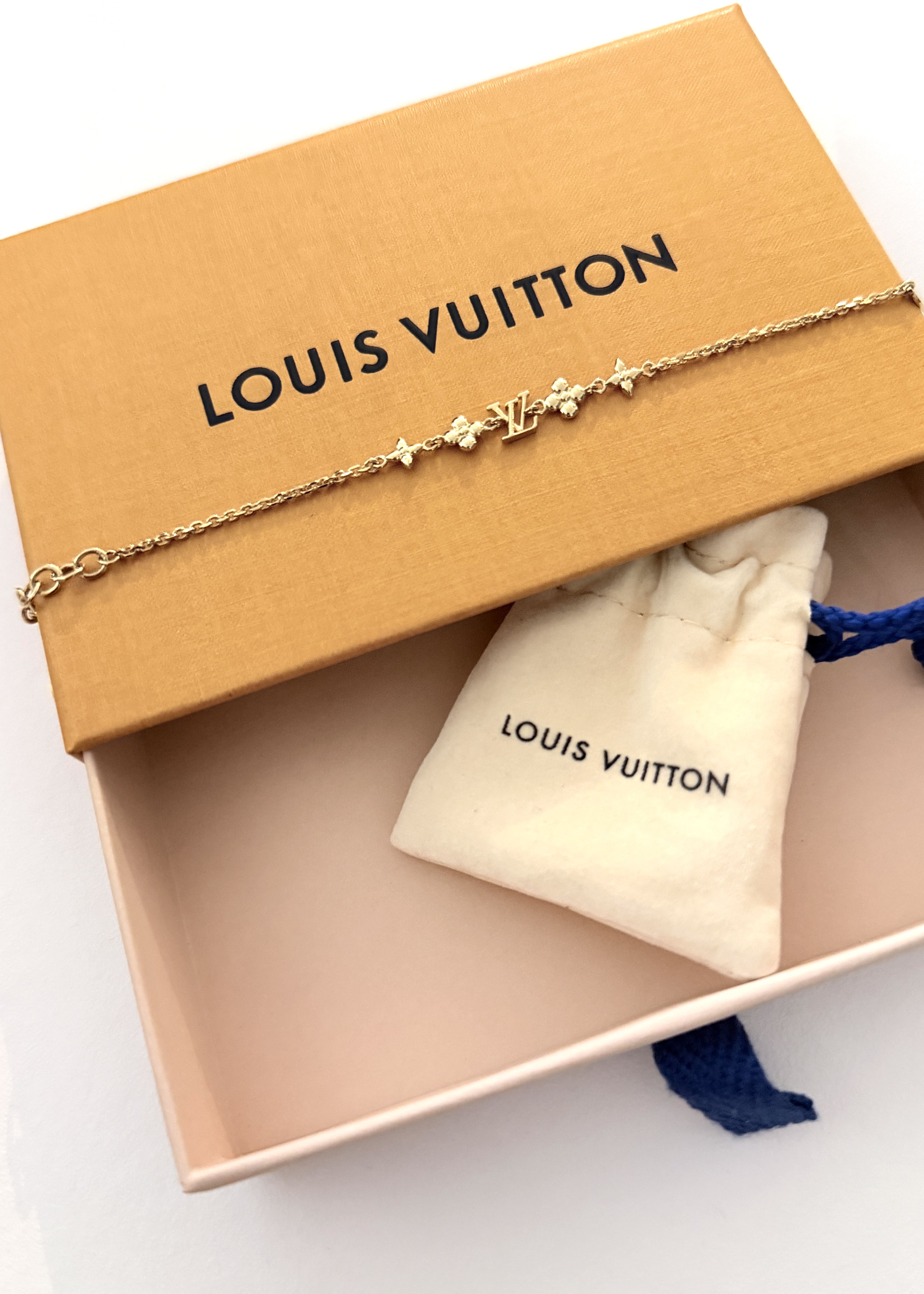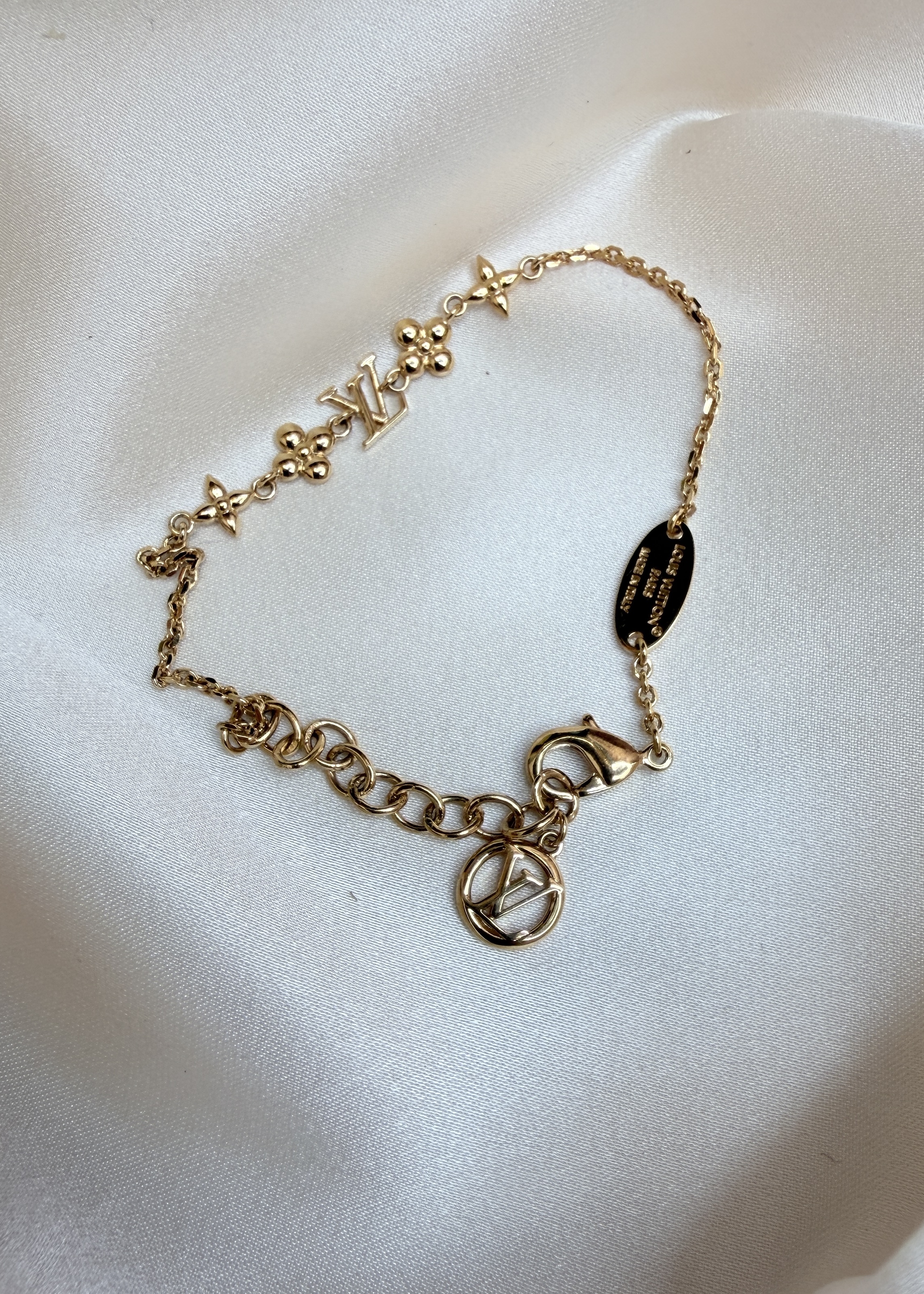 Delikatna bransoletka Louis Vuitton w kolorze złota, z motywami LV i Monogram Flowers. Łańcuszek z zapięciem na karabińczyk i przedłużką, dzięki czemu łatwo dopasować ją do nadgarstka. Lekka, subtelna i świetna do noszenia solo lub w zestawie z inną biżuterią.