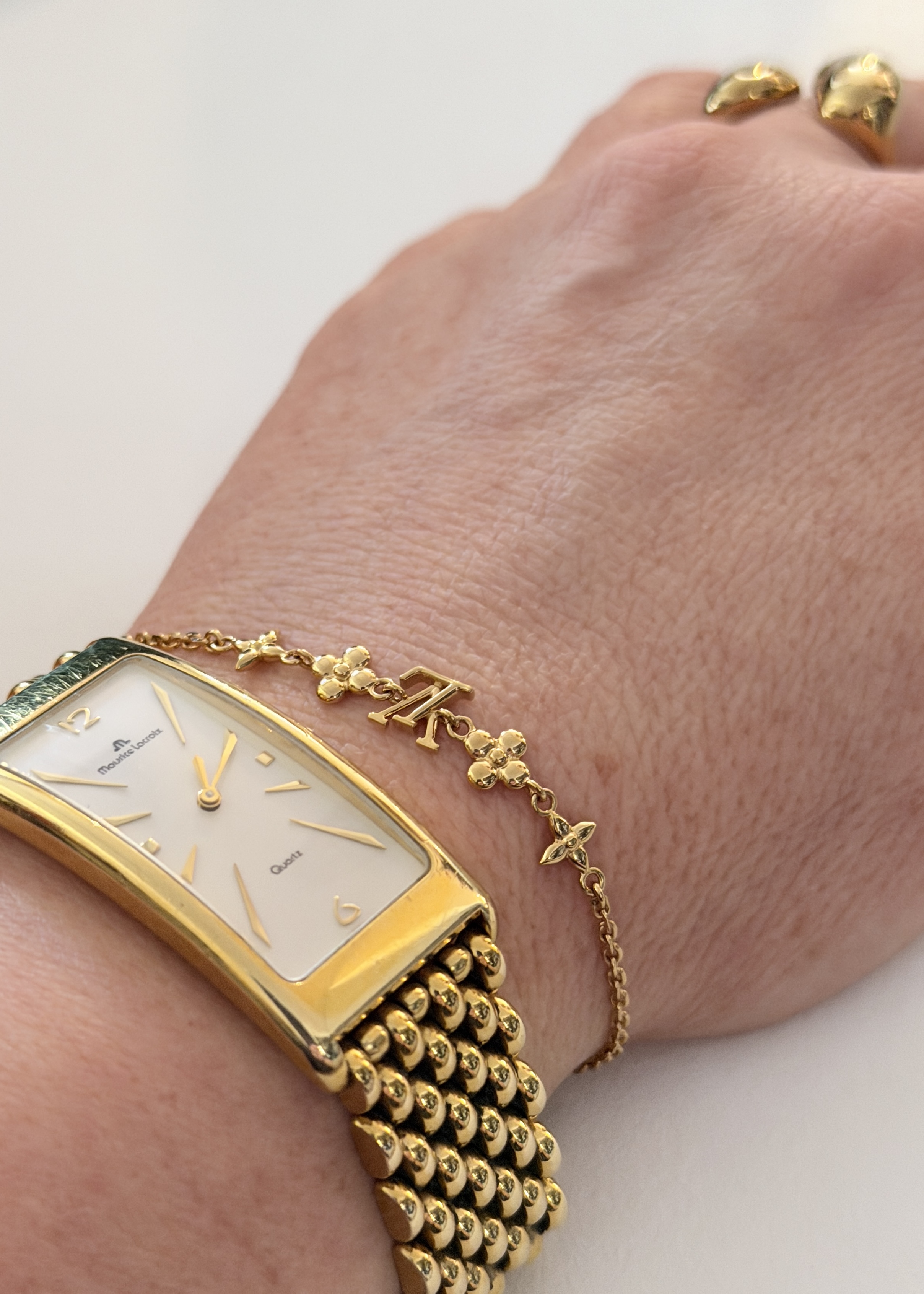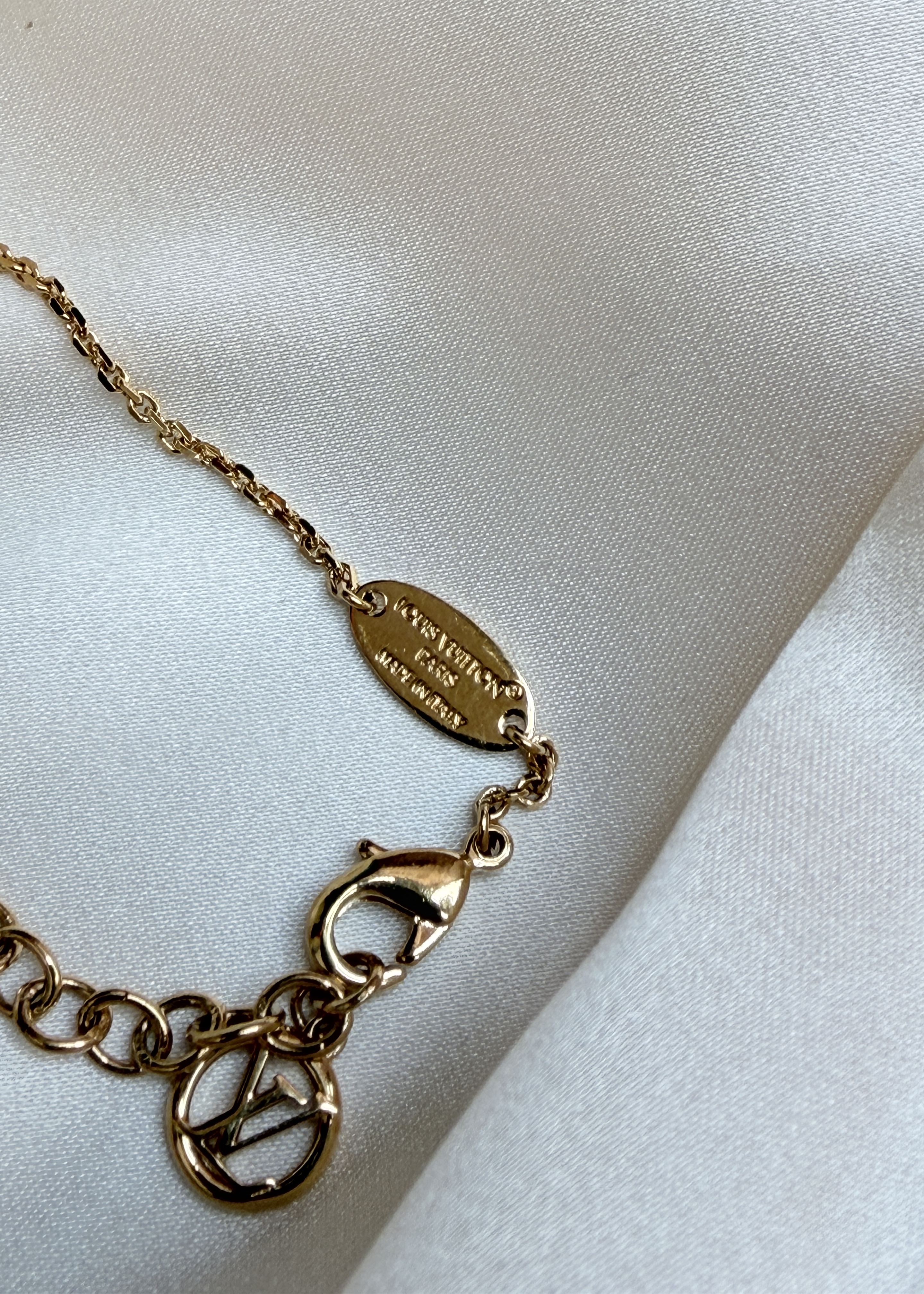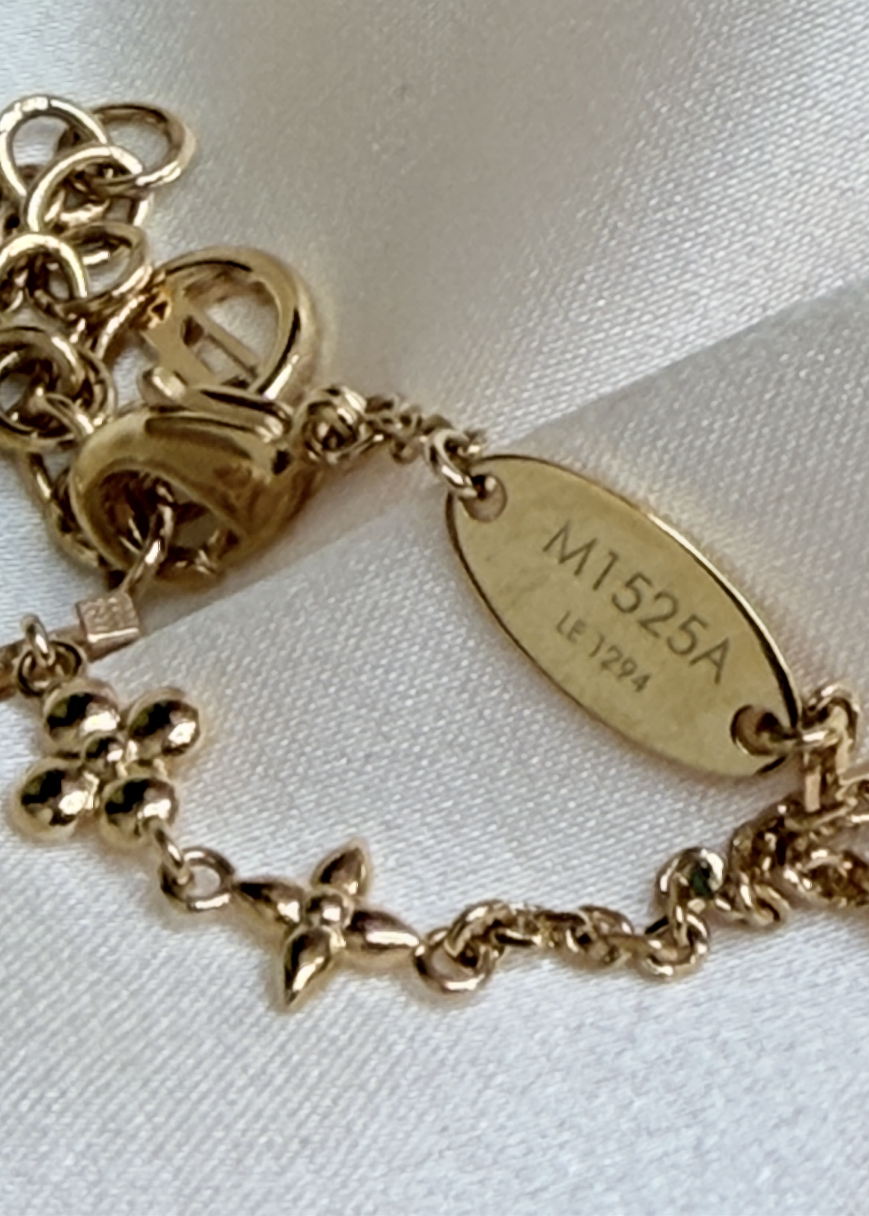 Delikatna bransoletka Louis Vuitton w kolorze złota, z motywami LV i Monogram Flowers. Łańcuszek z zapięciem na karabińczyk i przedłużką, dzięki czemu łatwo dopasować ją do nadgarstka. Lekka, subtelna i świetna do noszenia solo lub w zestawie z inną biżuterią.