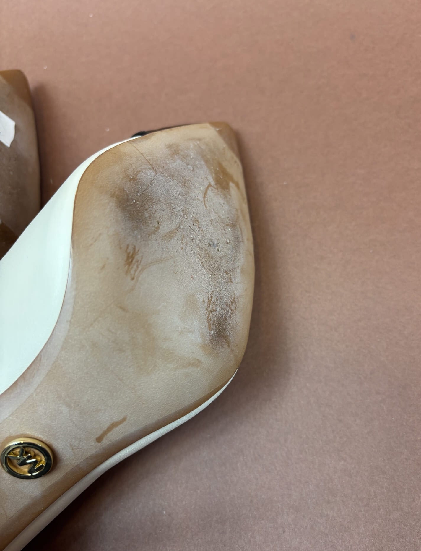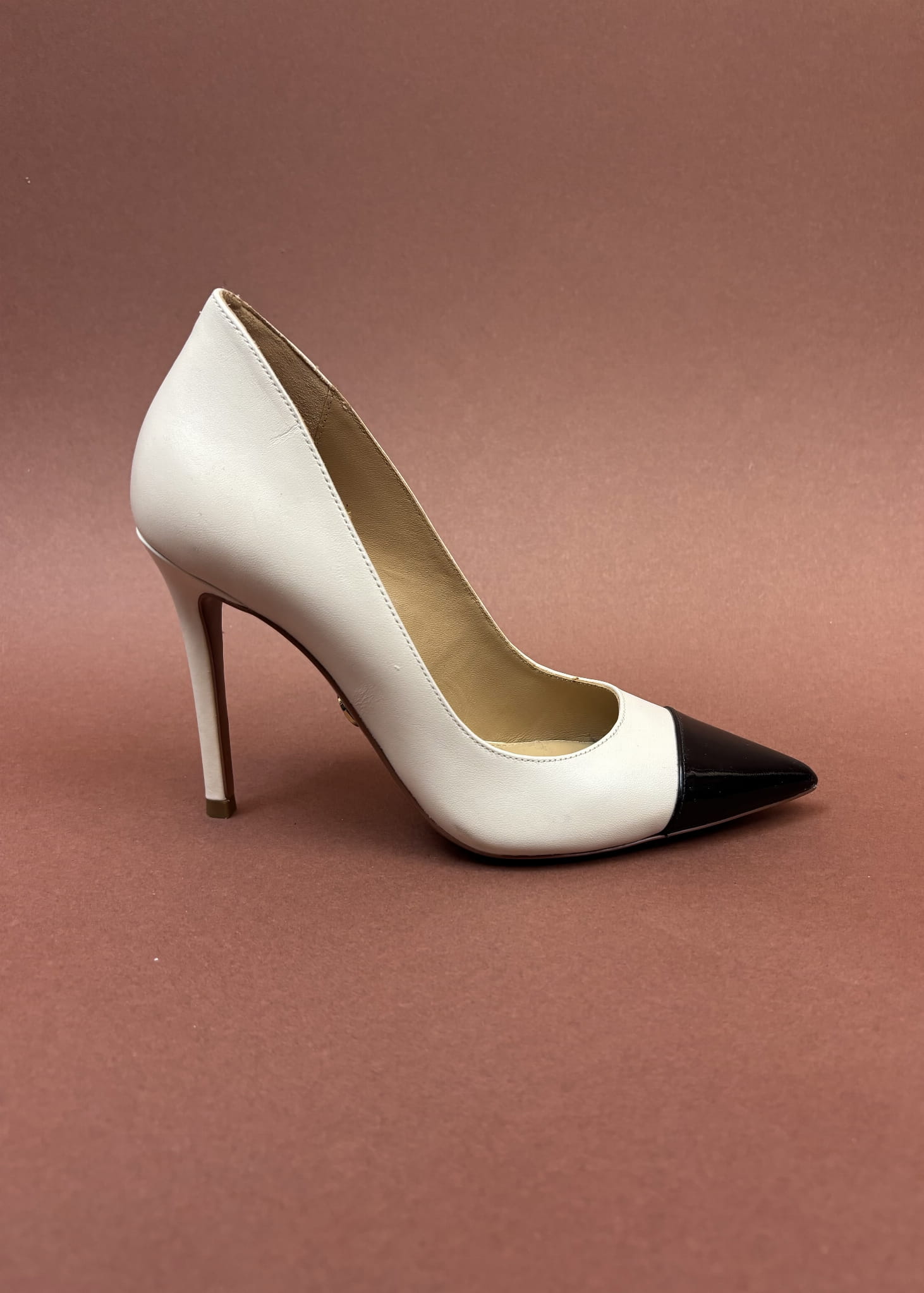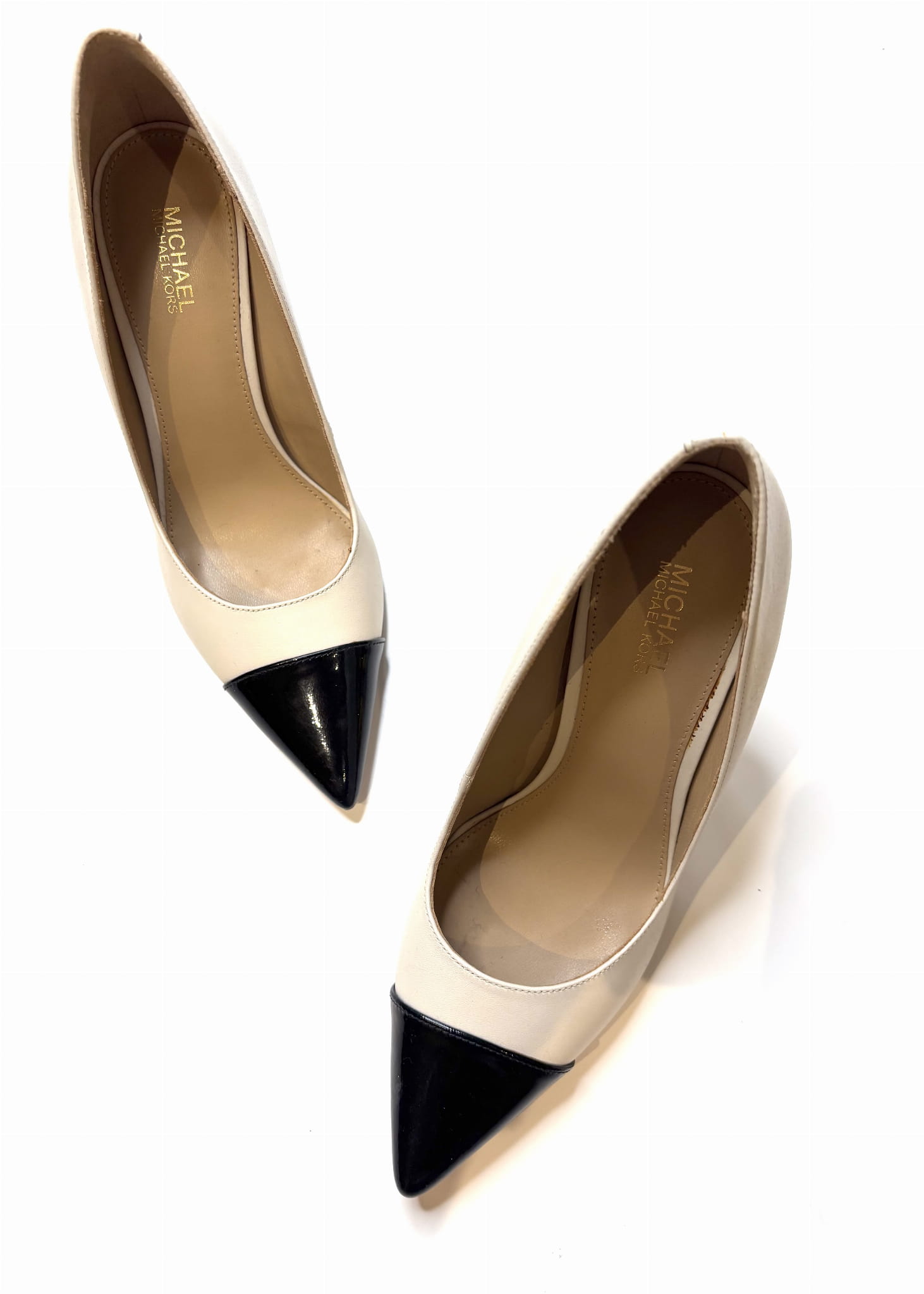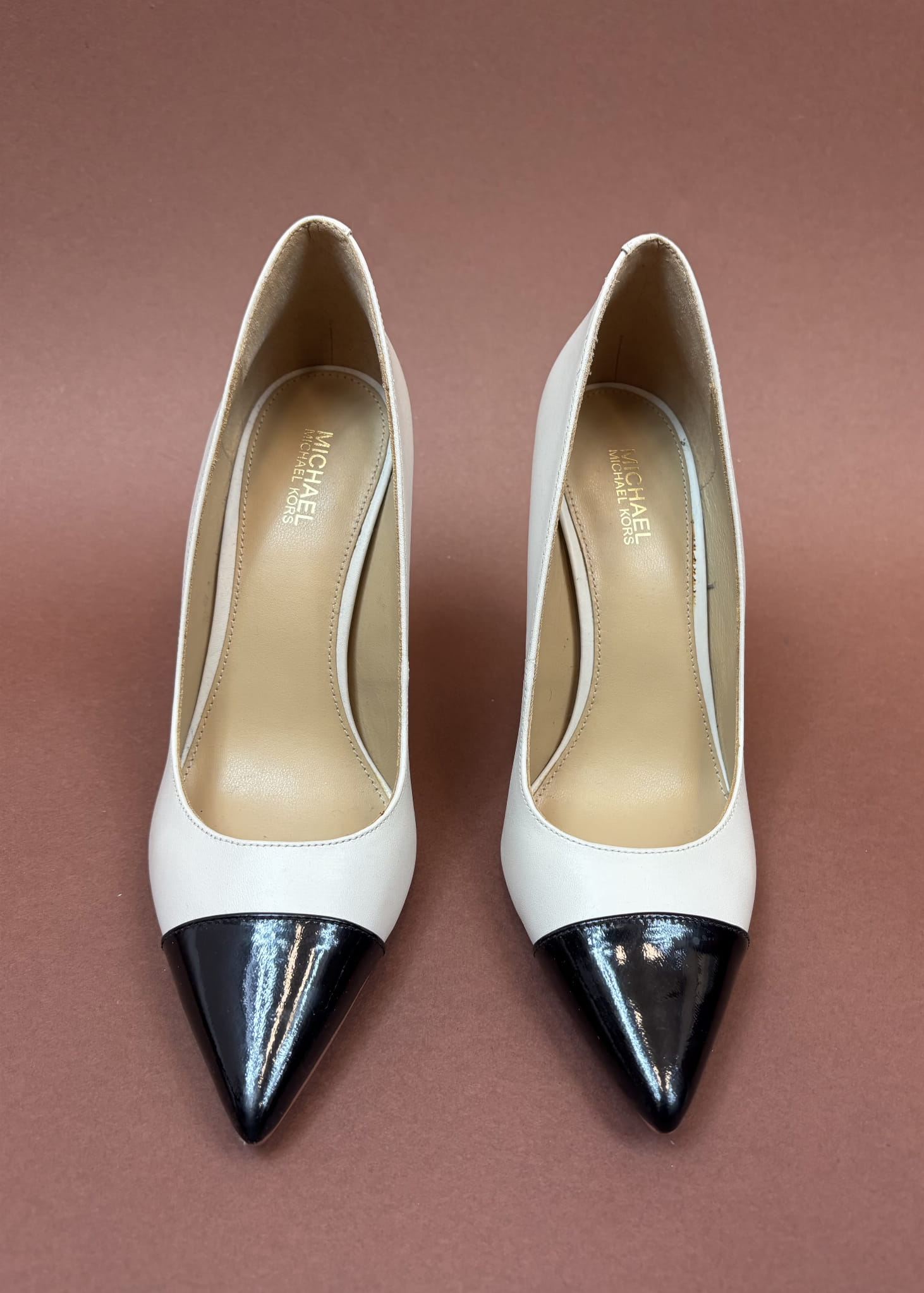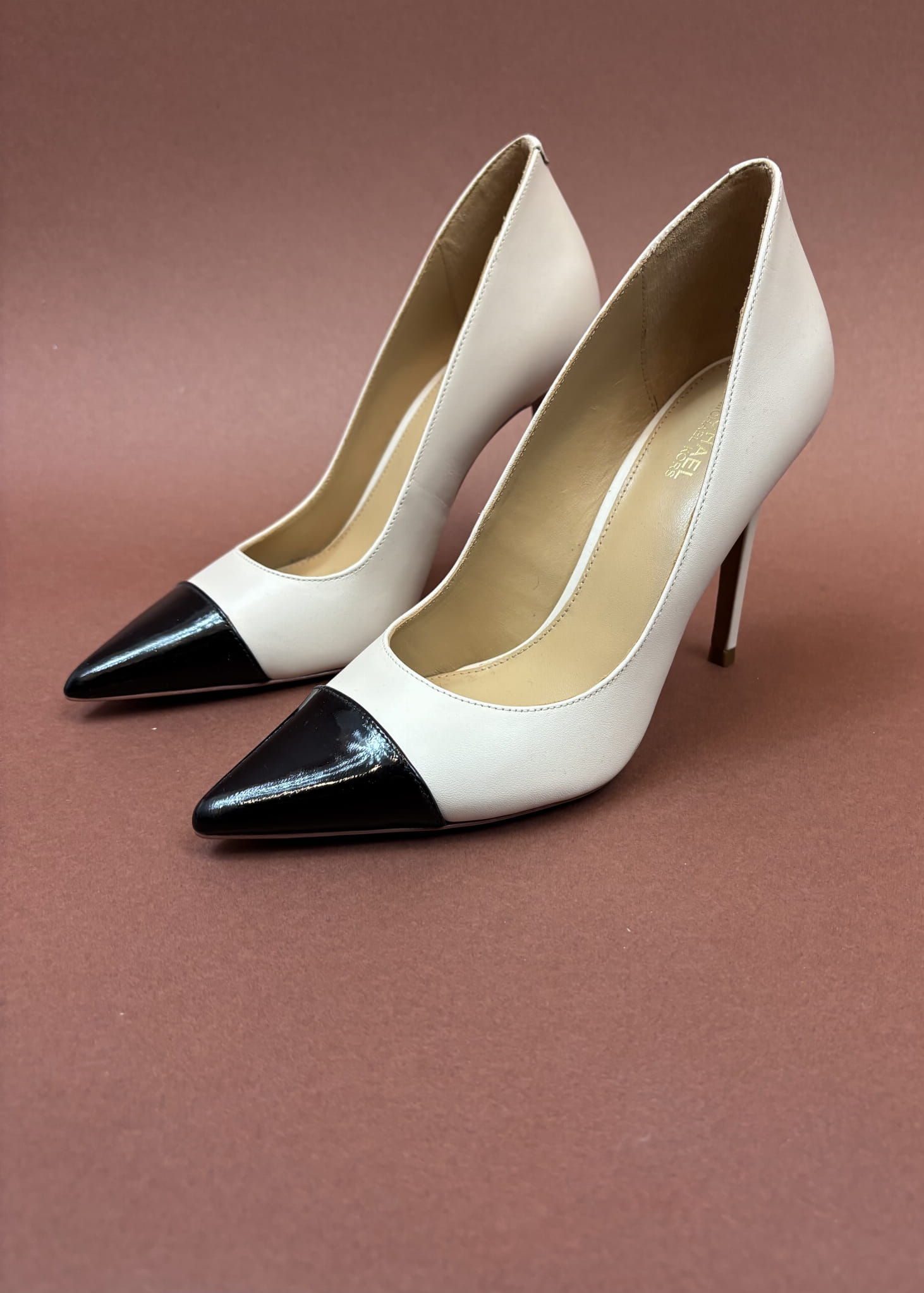 Eleganckie szpilki Michael Kors w odcieniu kremowej bieli, wykończone lakierowanym czarnym noskiem.