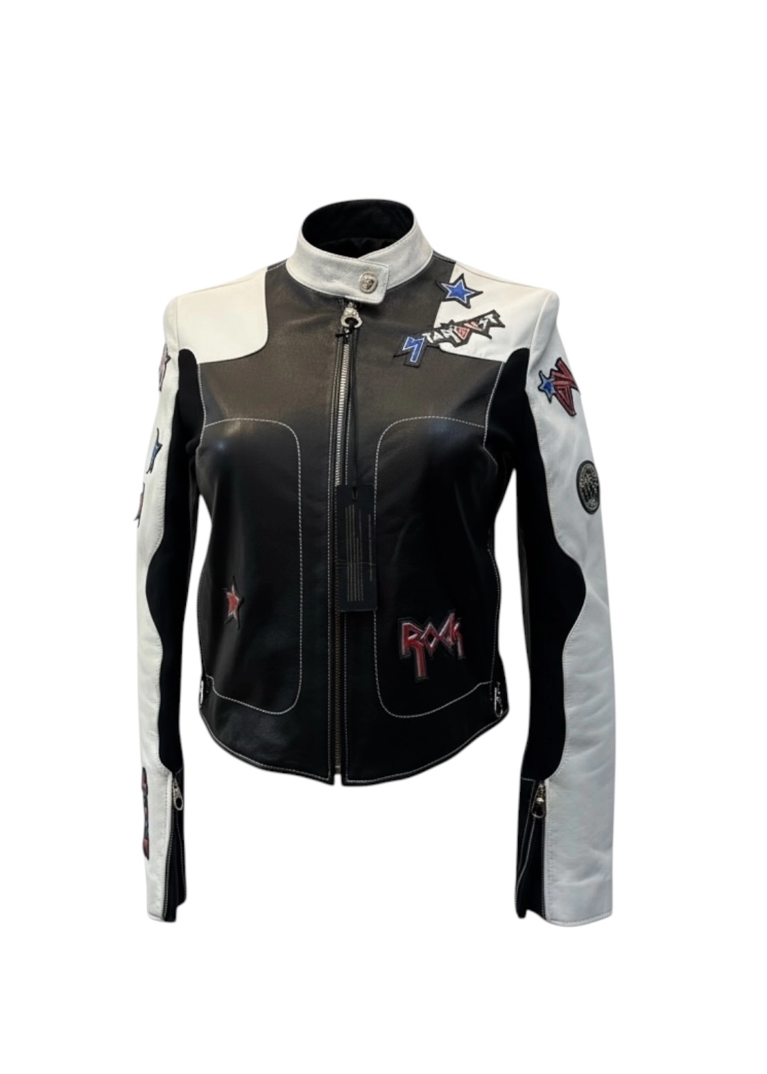 Nowa kurtka Versace z naturalnej skóry, w czarno-białym zestawieniu. Dopasowany fason, stójka, zapięcie na suwak i zamki przy rękawach. Model z naszywkami oraz dużym logo i printem na plecach.